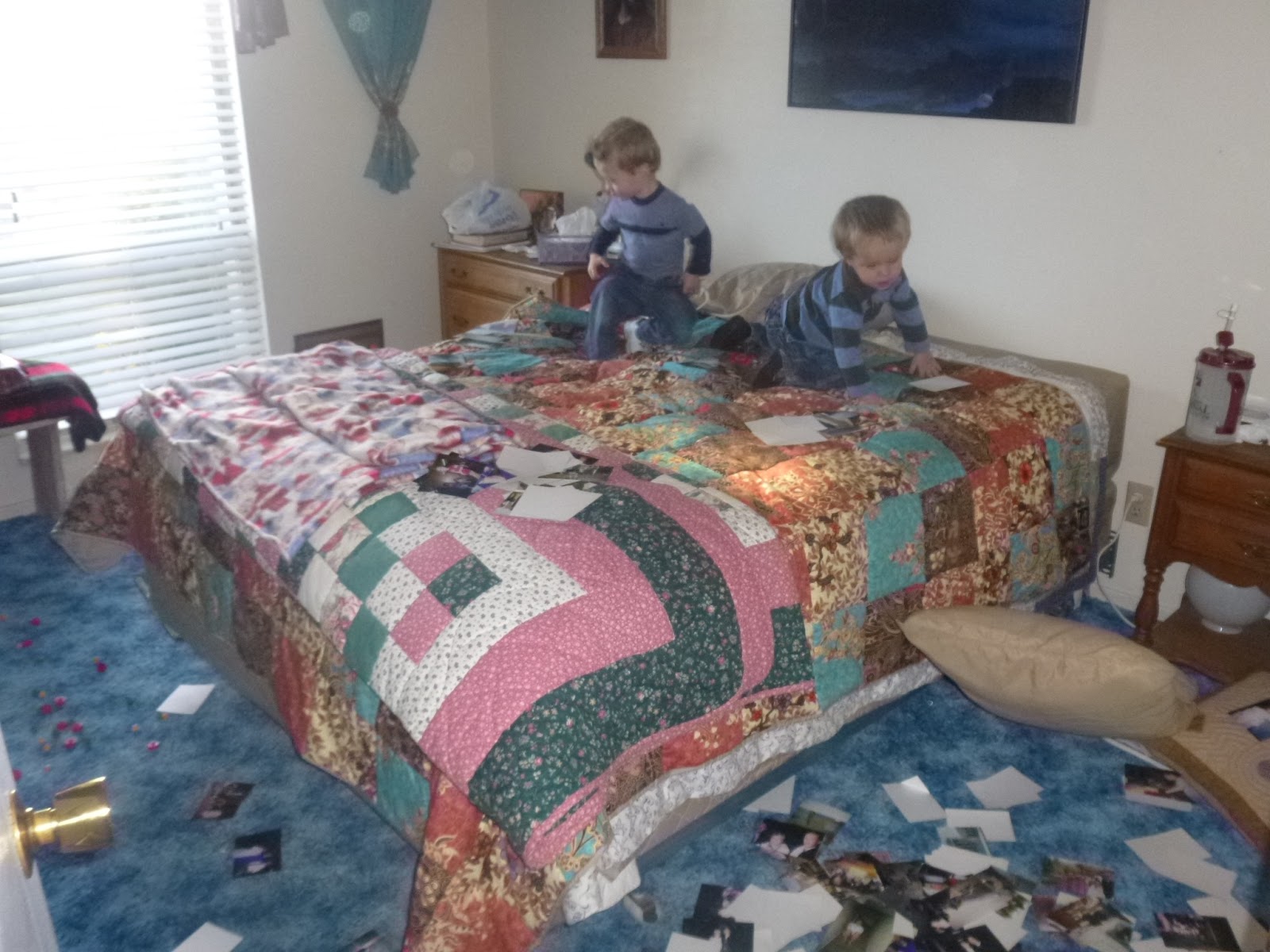 Carson is one of Brantleys favorite cousins. I love watching this two. They are hilarious! I caught them in one of Julies bedrooms jumping on the bed, and the two little stinkers found a big stack of pictures and threw them around the room. I should have taken Brantley off the bed but I couldn't help watching them.